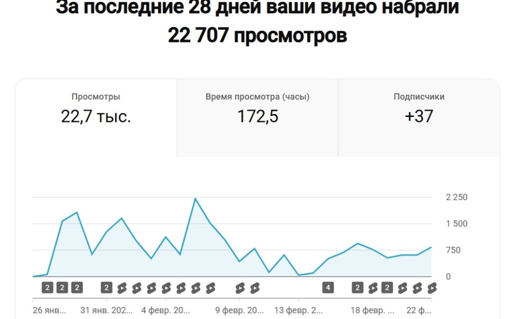 Максимальное число просмотров 2250. Минимальное ноль. Среднее около 750. Несколько дней просмотры были на нуле, это либо сбой ютуба либо готовность к рекомендациям, типа очереди. Анализ этого и меры — принимает маркетолог. после 13 февраля график без нулей, значит стратегия маркетолога — верная. Длительность просмотра — глубина по секундам за месяц увеличивается, 1 месяц средняя глубина — длительность 27.3 секунды. Это имеет значение? Да. Реклама вашего продукта как минимум 27 секунд, что больше платной рекламы.