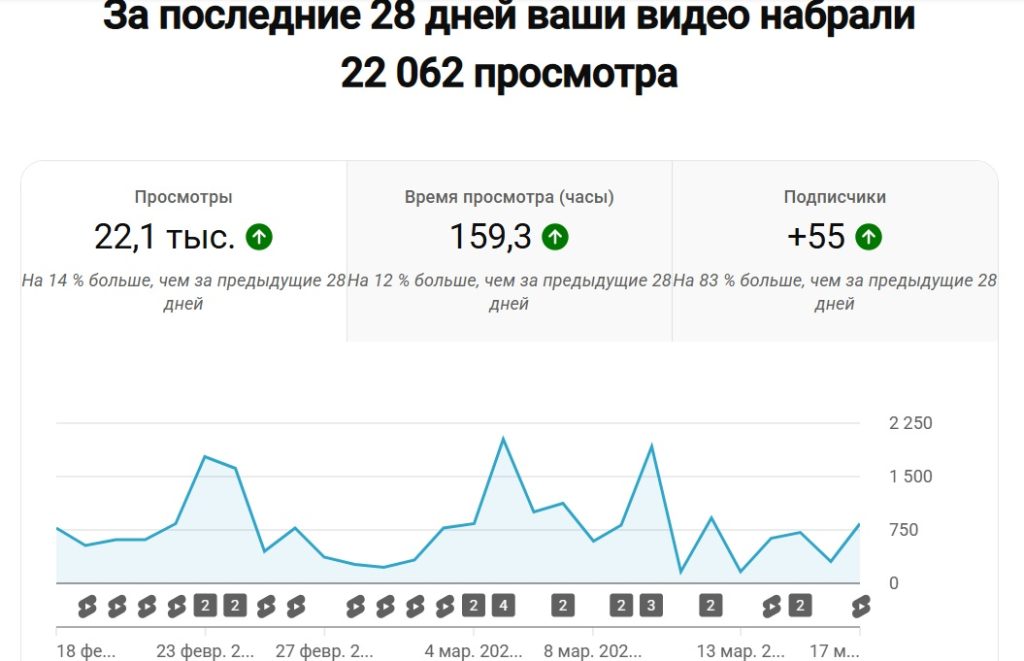 Динамика канала 7-14 дней. Всего 14 видео, из них 1 видео — 2200 просмотров, 1000+ просмотров 2 видео, 800-1000 просмотров 5 видео, 500-800 3 видео, 400-500 просмотров 3 видео. Незначительный рост числа подписчиков наблюдается. На следующий день +1 видео. Итого 15 видео. 2200 — 1 видео, остальные подтягиваются. 4 — 1000+ просмотров, 800-1000 — 8 видео, 500-800 — 2 видео. Подписчики прибавляются нехотя.